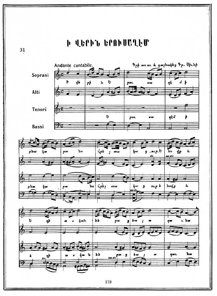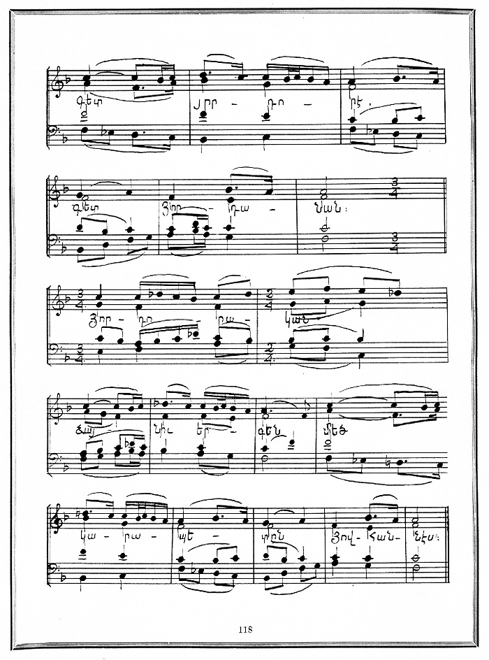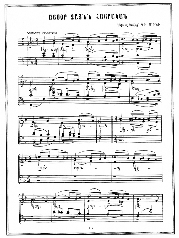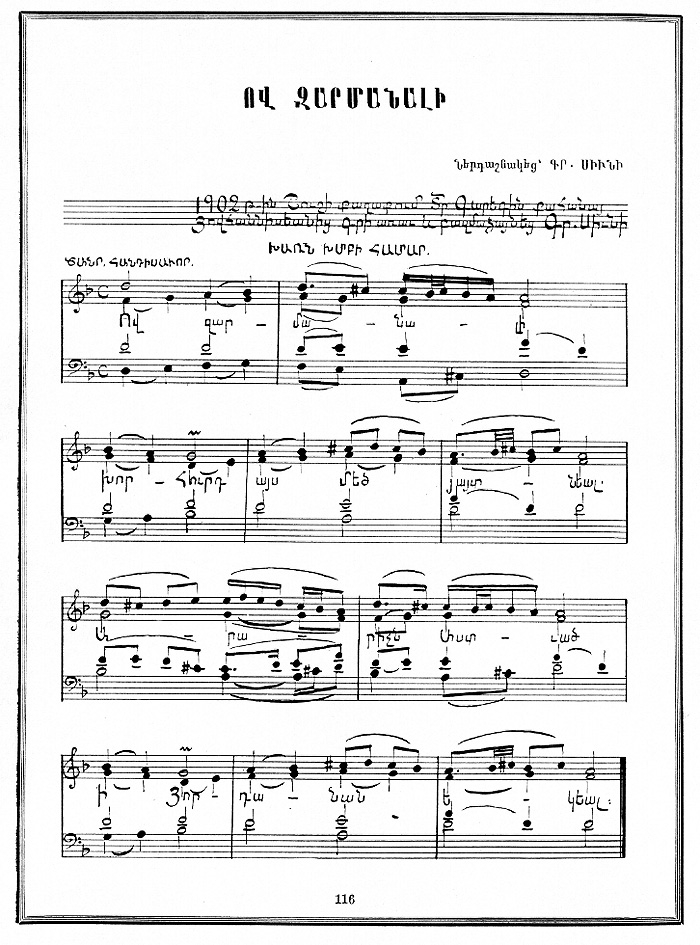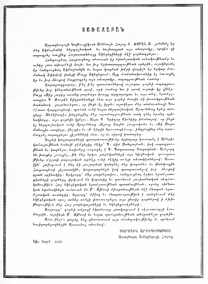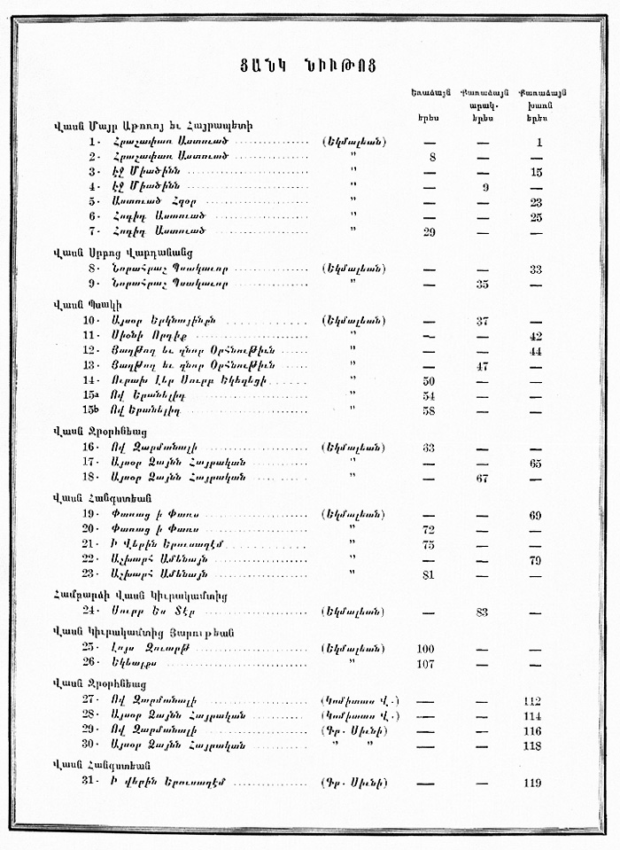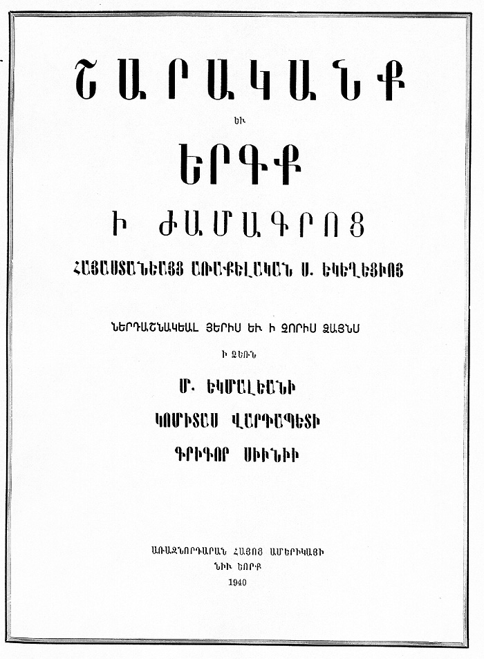 The Armenian Church Archbishop Garegin in 1940 published this book in New York, Sharakank yev Yergk I Zhamagrots with the forward he’d written in 1939, to feature liturgical works of Grikor Mirzaian Suni side by side with those of the two most known Armenian composers of church songs- Suni’s colleagues Komitas Vardapet and Makar Yekmalian. The archbishop found Suni’s renderings of the church melodies to be valuable